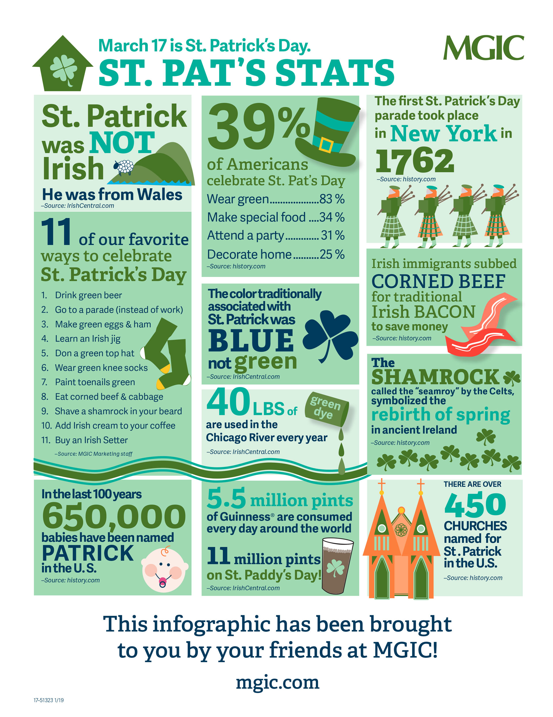 What began as a religious feast day for the patron saint of Ireland has become an international festival celebrating Irish culture. St. Patrick’s Day is celebrated every year on March 17. Check out some of our favorite stats about St. Patrick’s Day in this fun holiday infographic.